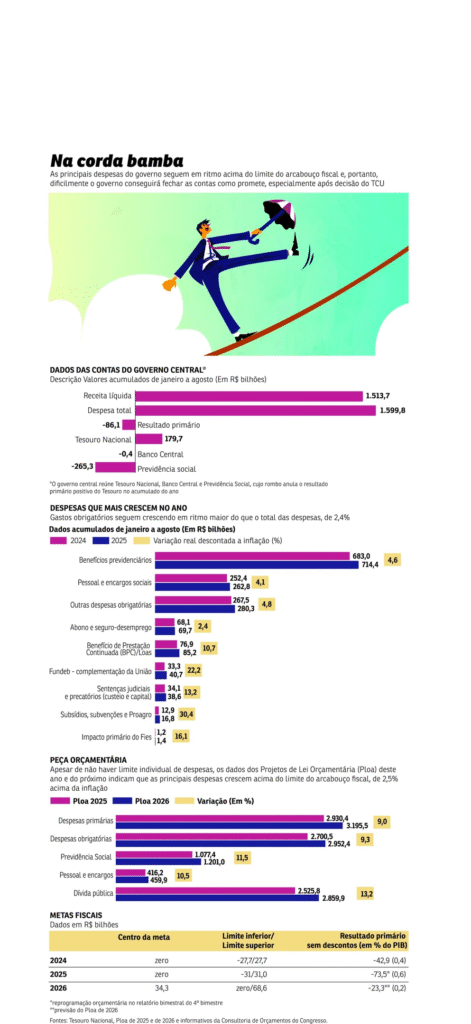 A recente decisão do Tribunal de Contas da União (TCU), que orienta o governo federal a parar de perseguir o piso da meta fiscal, tem chances de ser a desculpa que o Executivo queria para mudar a meta fiscal novamente, como ocorreu poucos meses depois de a regra do arcabouço fiscal ter sido aprovada, em 2024, de acordo com especialistas. Eles lembram que o governo só consegue cumprir as metas de forma contábil, com descontos de despesas — o que tem deixado a regra do arcabouço frouxa, pois os principais gastos obrigatórios do Orçamento seguem crescendo acima do limite de 2,5% acima da inflação previstos. Logo, a conta não fecha.
